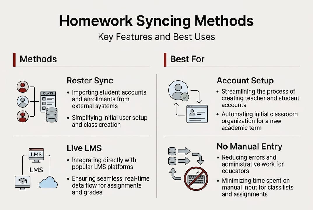 - Roster sync: Automatically imports your class list and student account details from your school's system. This is mostly used by teachers, but it affects how your assignments appear in student-facing apps.